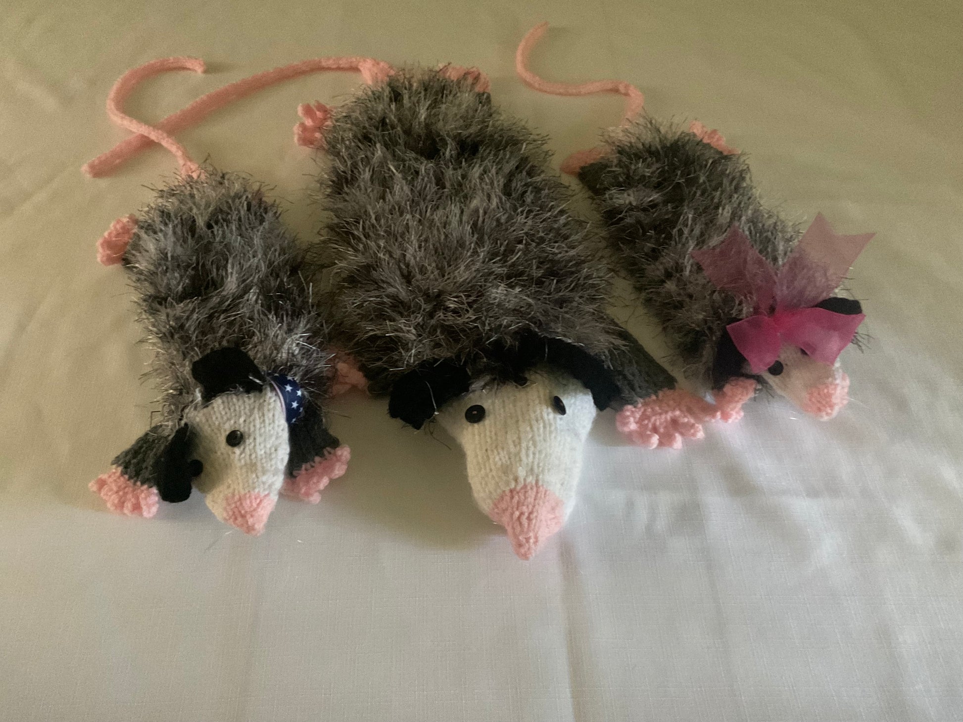 The trio of Opossum were creatively crafted on knitting needles in one piece. The large Opossum measures 36” from nose to the tip of the tail. The boy Opossum daunts a patriotic bow tie. The female Opossum daunts a fuchsia hair bow. They both measure about 27” from the tip of their nose to the end of their pink tails