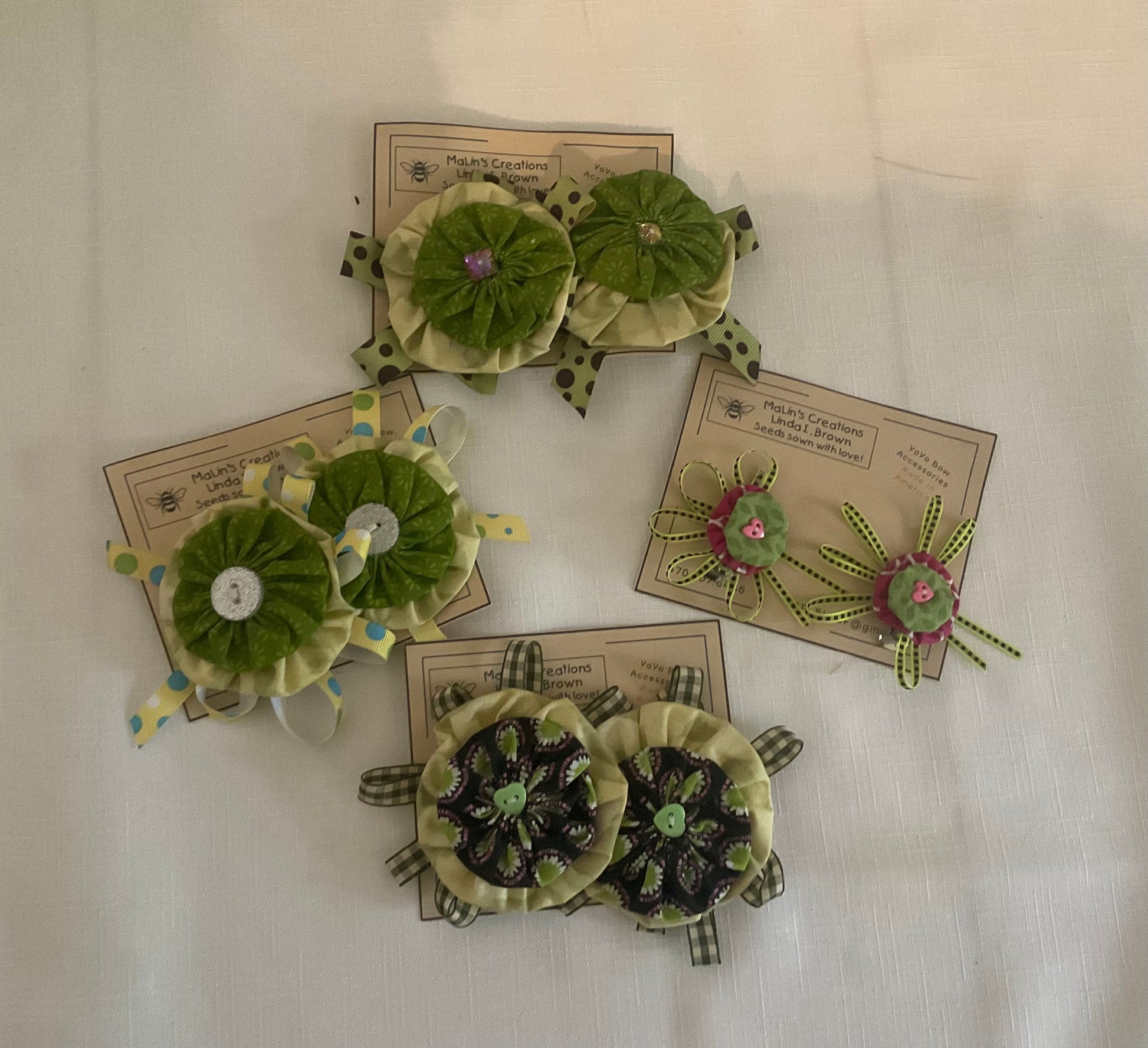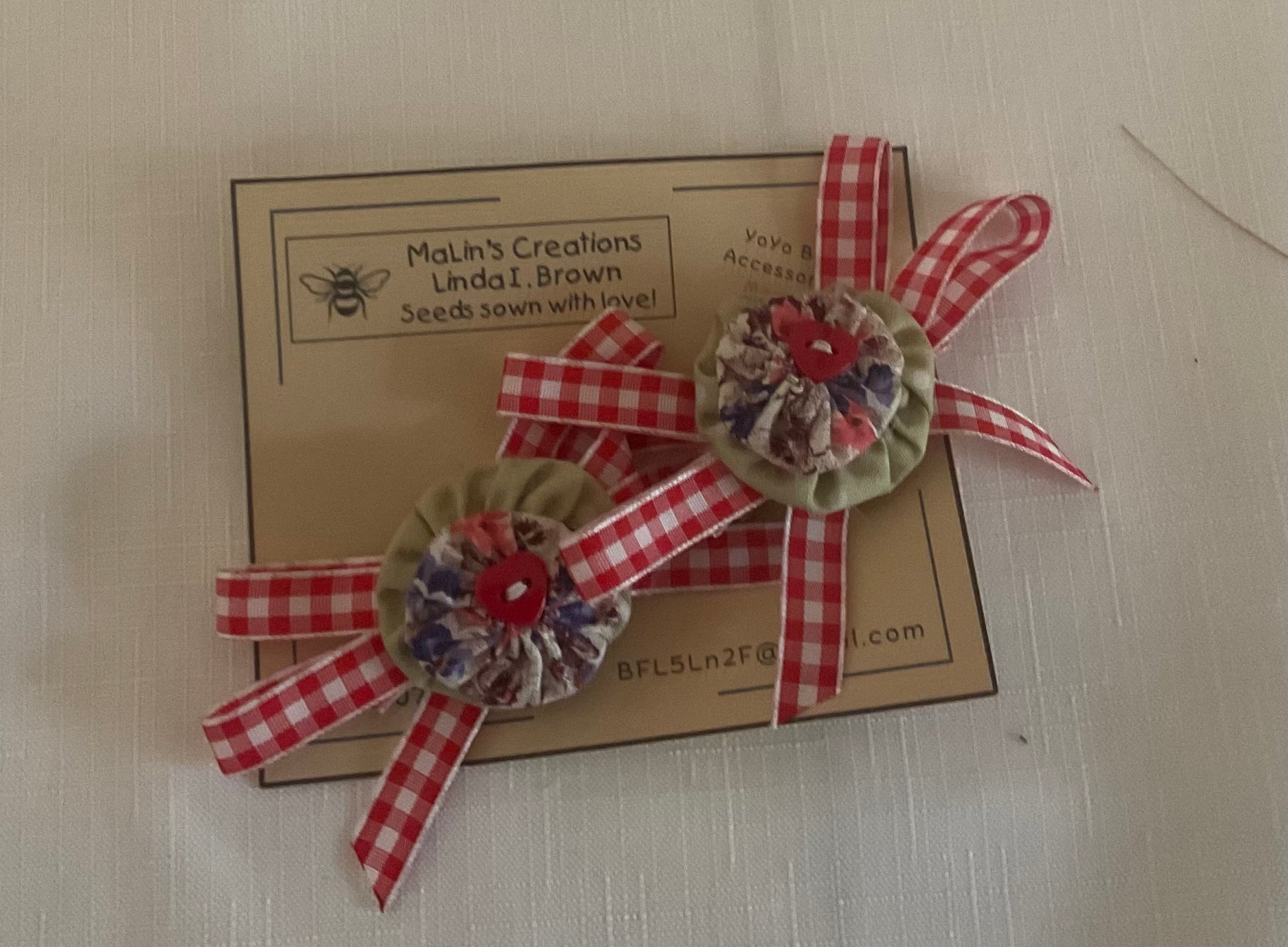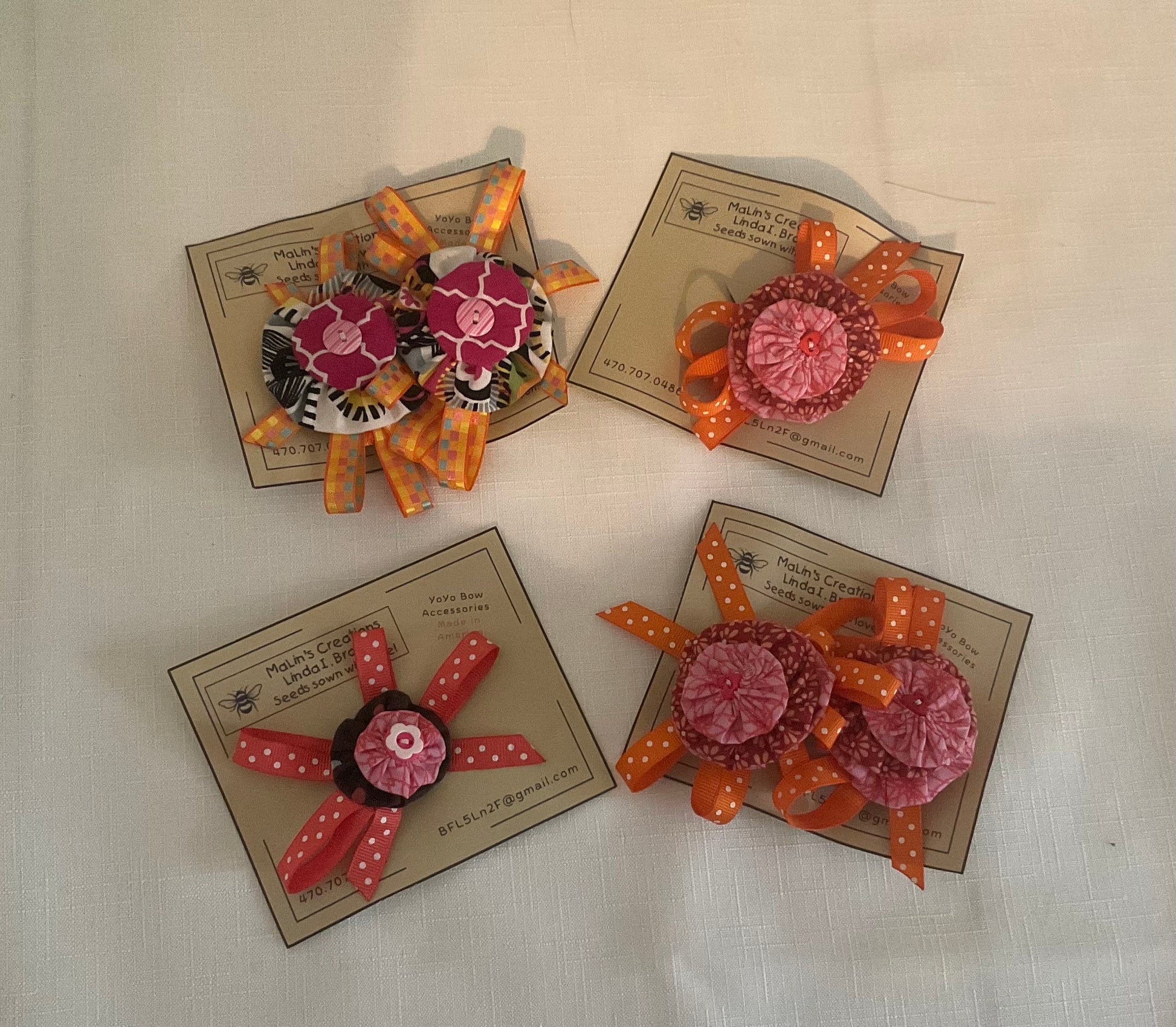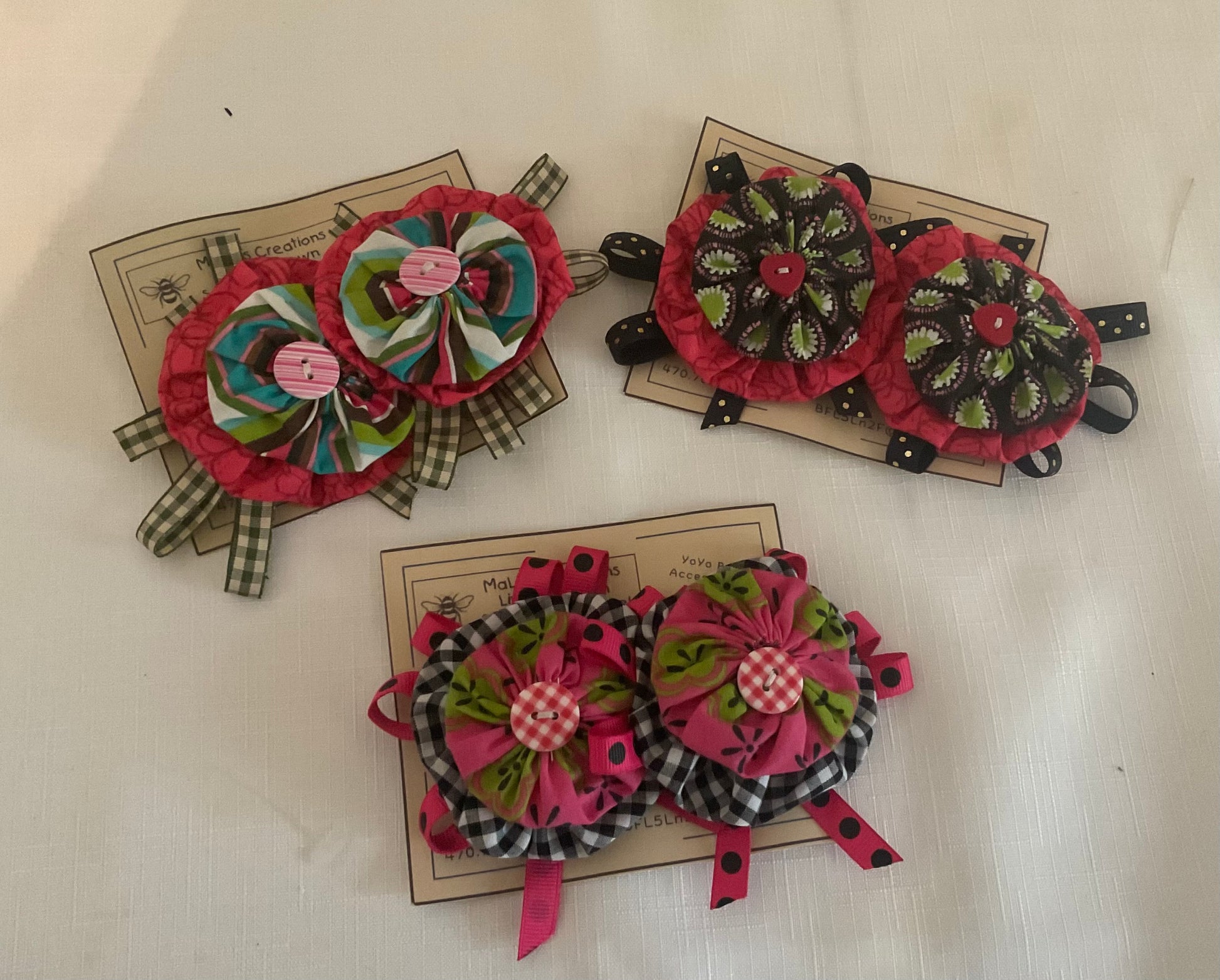 Yo-Yo Hair Bows with clips, a mixture of the quilting yo-yo pattern, ribbon and buttons are mounted on hair clips. These Yo-Yo bows are all handmade with care. They are $12.99 each.